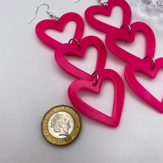 Hot Pink Dangly Triple Heart Earrings